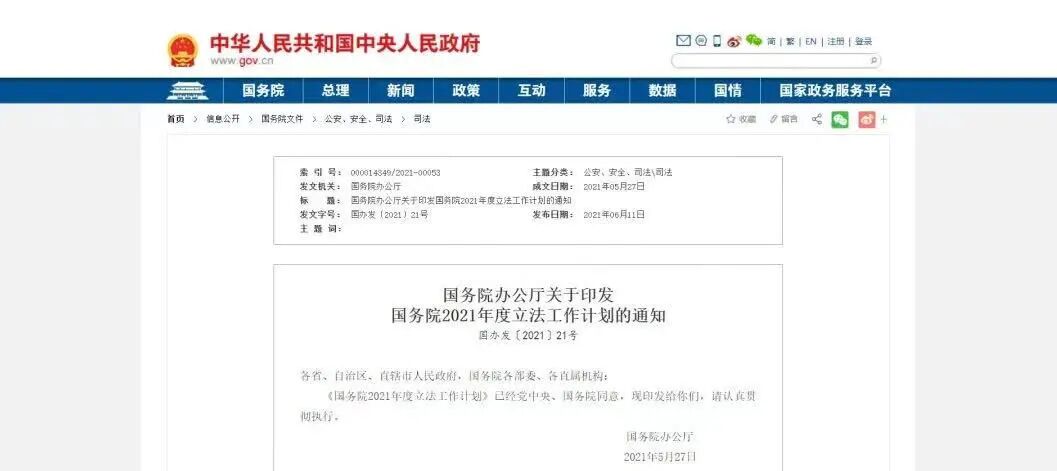 《国务院2021年度立法工作计划》已经党中央、国务院同意,现印发给你们,请认真贯彻执行。